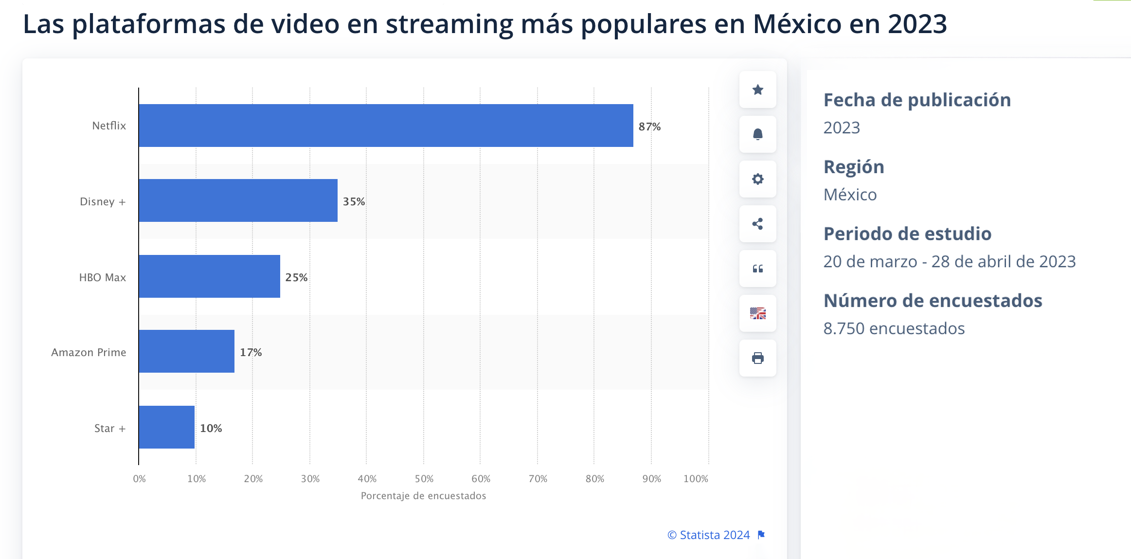 Un estudio realizado por Statista entre marzo y abril del 2023, un 87 % de las personas encuestadas que consumen servicios de video vía streaming en México afirmaron usar Netflix; el 35 %, a través de Disney+; un 25 %, vía HBO Max; Amazon Prime, solo un 17 % y Star+, con un 10 %.