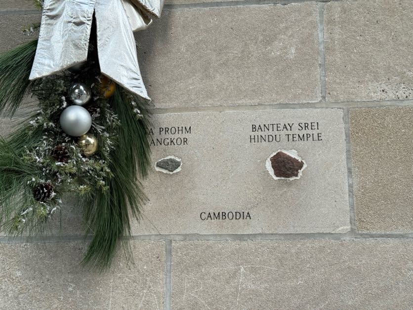 Allí, mezcladas entre la piedra caliza, hay pequeñas ventanas al mundo. Algunas diminutas, otras de gran tamaño: fragmentos de historia incrustados discretamente. Un pedazo de la Gran Muralla China, otro del Partenón, un bloque del Taj Mahal, restos del Muro de Berlín, una decoración de dragón del Antiguo Palacio de Verano de Pekín y hasta un trozo de roca traído desde Antártida. No hay luces, ni vallas, ni protocolos. Solo están ahí, expuestos al viento frío, al tacto de cualquiera que pase y se atreva a quitarse los guantes para sentir su textura.